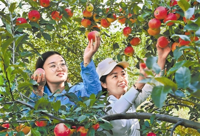 游客在米脂縣高西溝村蘋果采摘園采摘蘋果。新華社記者 陶明 攝