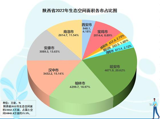 陜西南部秦巴山脈、北部黃土高原、中部渭河川地,自然生態空間多、占比大。陜西省生態空間數據中心提供的數據顯示,全省國土空間3.08億畝,其中生態空間(林地、草地、濕地、荒野)2.26億畝。從全省10市生態空間大格局分析觀察,黃土高原腹地的延安是全省最大的生態蛋糕房,也即生態空間第一市,生態空間4671.9萬畝、占本市國土空間84.1%、占全省生態空間20.6%。長城內外、林草過度的榆林居第二,生態空間4299.7萬畝、占本市國土空間66.8%、占全省生態空間19.0%。第三是漢中,生態空間3432.2萬畝、占本市國土空間84.4%、占全省生態空間15.1%。第四是安康,生態空間3089.3萬畝、占本市國土空間87.5%、占全省生態空間13.6%。其后,依次分別是商洛,生態空間2614.7萬畝、占本市國土空間90.0%、占全省生態空間11.5%,寶雞2014.4萬畝、占本市74.1%、占全省8.9%,西安948.1萬畝、占本市62.6%、占全省4.2%,渭南617.4萬畝、占本市31.5%、占全省2.7%,咸陽612萬畝、占本市39.5%、占全省2.7%,銅川362.5萬畝、占本市62.2%、占全省1.6%。就生態空間規模論,一個延安市超過了關中五市之合。