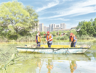 “小心腳下,注意身體平衡……”湖邊傳來一陣急促的呼喊聲,循聲望去,只見湖面上一只木船緩緩而行,三名身穿橙色救生衣的男子,一人掌舵、一人手握鐮刀,快準狠地割斷一片片水草,另一人時不時地撈起水面上的雜物。