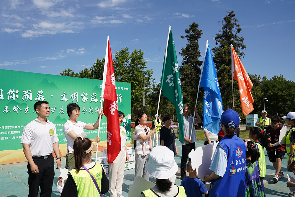 在活動啟動儀式上,陜西交控環境科技有限公司向秦嶺國家植物園工作人員贈送慰問品,文明家庭代表向參加活動的總工會志愿者、交控環境公司志愿者、益人行志愿者、中糧集團志愿者隊伍授旗。