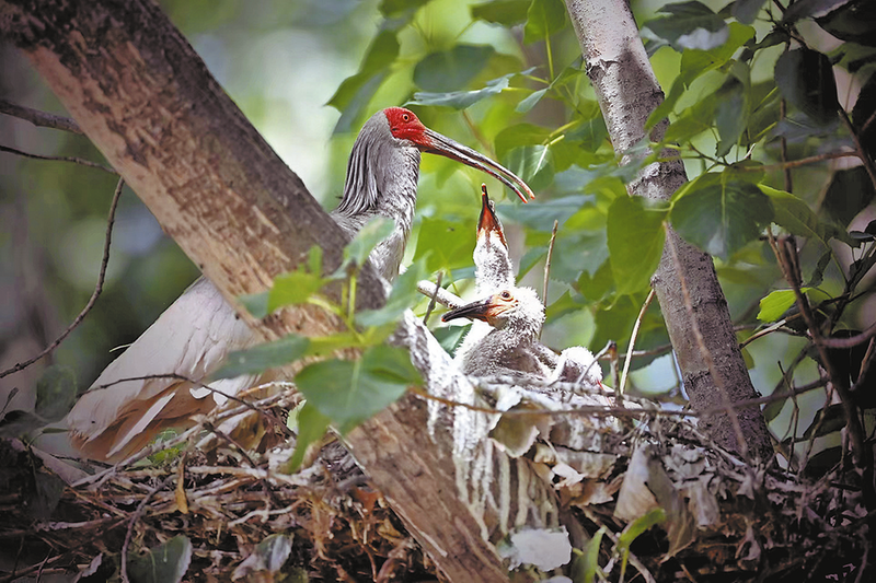 2021年在華山腳下野化放飛的朱鹮,于2022年5月,繁育出3只“華山派”雛鳥朱鹮。 (華陰市林業局提供)