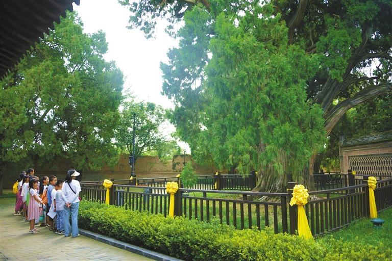 八月二十八日,在渭南市白水縣史官鎮倉頡廟,游客在觀看倉頡手植柏。