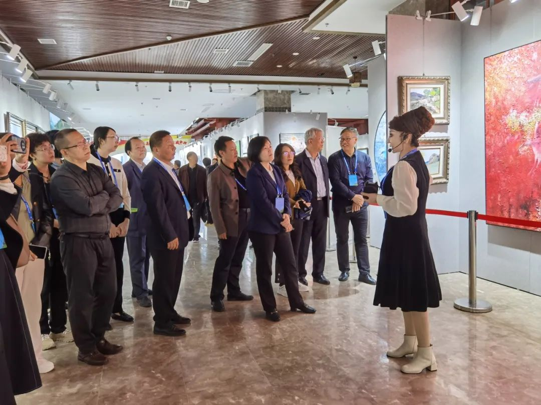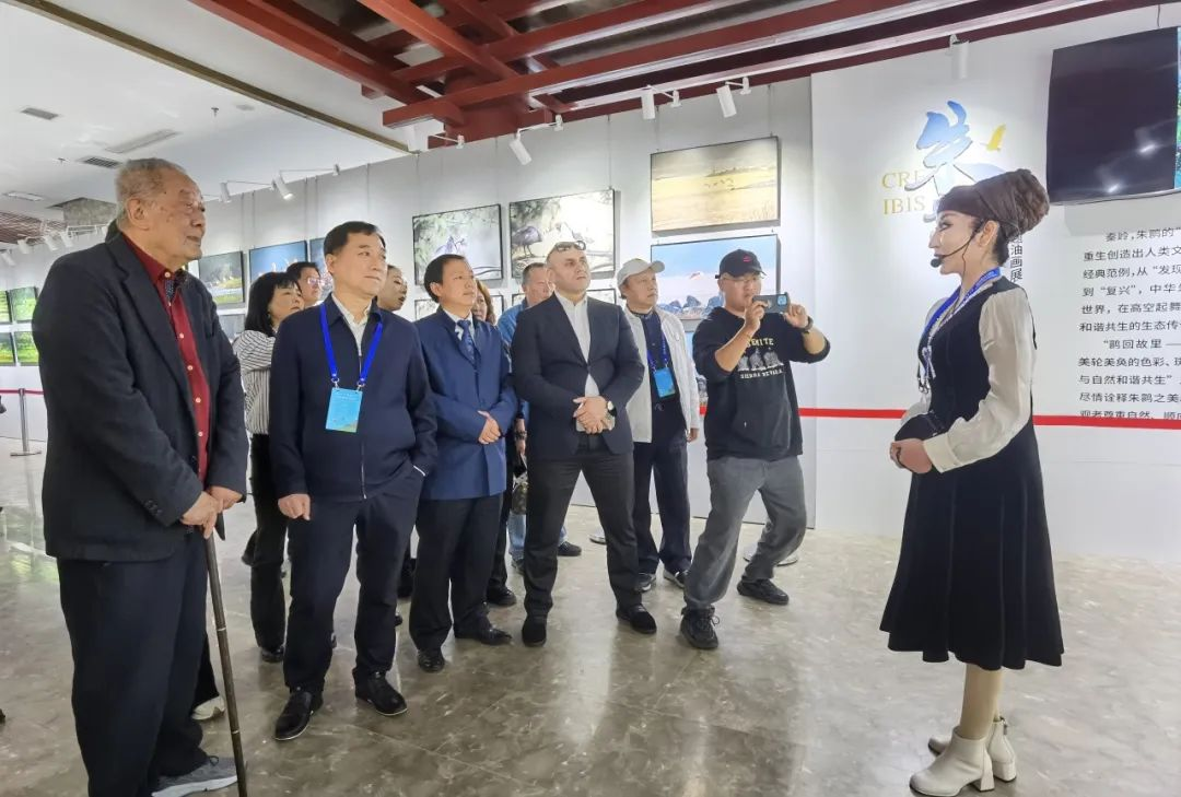 晏子油畫家向參加“生態漢中·鹮美天下”2023朱鹮文化交流活動的代表講解朱鹮油畫作品