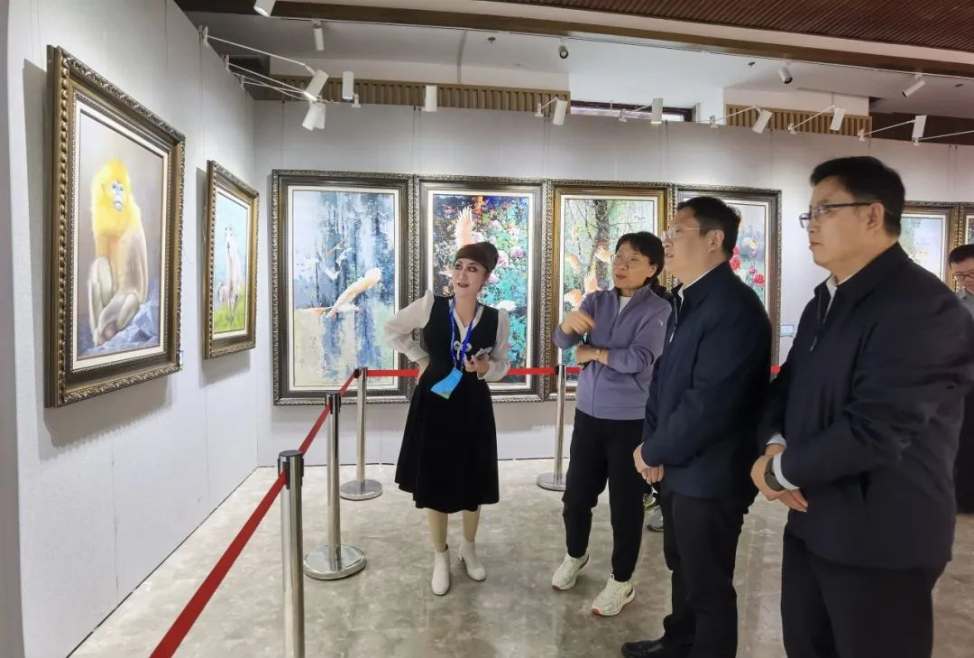 晏子油畫家向國家林業和草原局國際合作司劉昕司長(左二)、陜西省林業局鄭重局長(右二)講解油畫作品