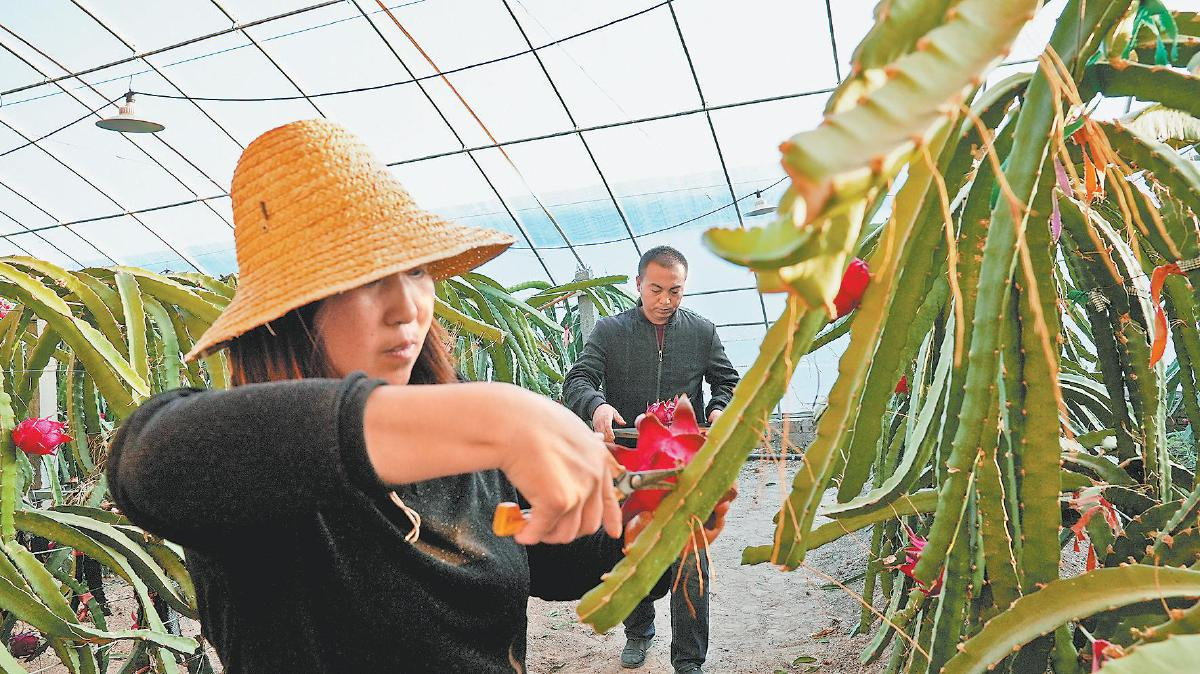 園區工作人員正在采摘火龍果。趙娜 攝