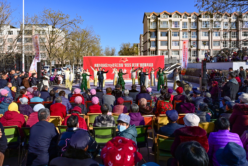 2024年11月21日,在內蒙古伊金霍洛旗阿勒騰席熱鎮,烏蘭牧騎隊員表演歌舞節目。新華社發(王正?攝)
