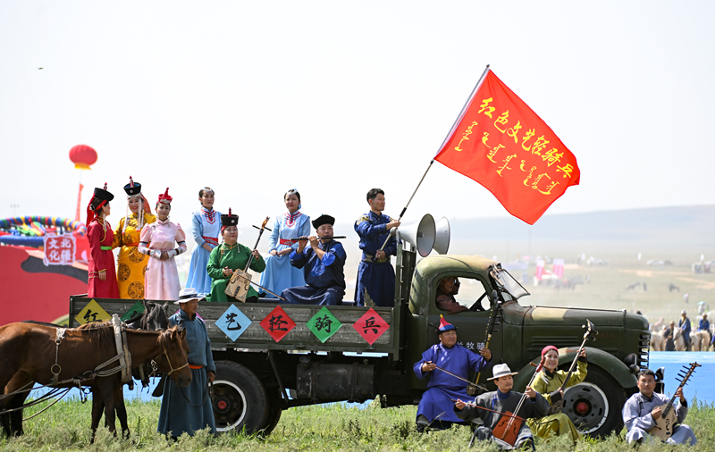 2024年7月14日,烏蘭牧騎隊員在“相約草原·遇見那達慕”內蒙古第34屆草原那達慕開幕式上表演。新華社記者 貝赫 攝