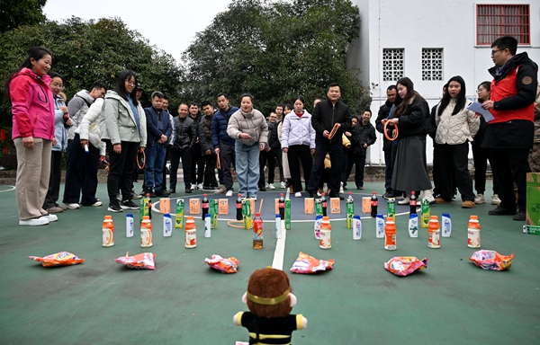 陽朔縣楊堤鄉工會聯合會組織全體干部職工開展新春趣味游園活動,通過集體協作與個人競技相結合的形式,進一步增強團隊凝聚力?;顒影魏颖荣?、雙腿夾紙接力跑等集體項目,以及套圈、蒙眼敲鑼等個人趣味游戲。參賽人員通過抽簽分組競技,現場氣氛熱烈,歡聲笑語不斷?;顒釉O置多項獎勵機制,集體項目按積分排名頒發沐浴露、洗衣液等實用獎品,個人項目則通過套圈、敲鑼贏取洗發水、毛巾等禮品。