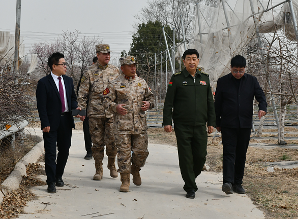 山西省臨汾軍分區領導閆天兵(右二)赴大寧縣視察“兵支書”模式賦能的鄉村振興產業。