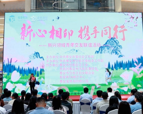 4月26日,山東省泰安市“新心相印攜手同行”新興領域青年交友聯誼活動在愛琴海購物公園舉行,來自全市非公有制企業經濟組織、網約配送員、快遞員、網絡主播等新就業群體的青年朋友們相聚在一起,開啟一場別開生面的尋緣之旅。