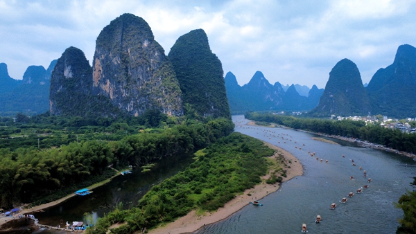 漓江之上浩浩蕩蕩的竹筏大軍。陽朔縣漓江景區公司供圖