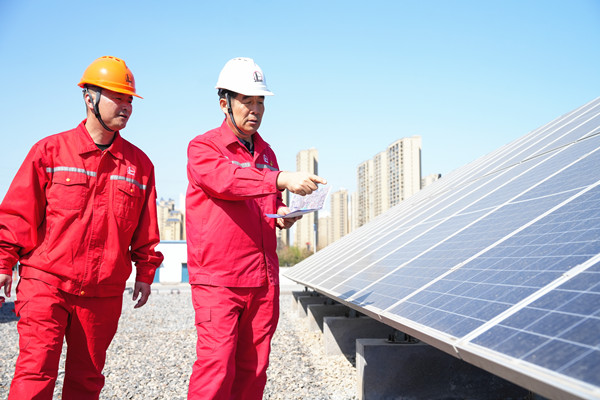 3月28日,勝利油田東辛采油廠永安管理區的陳加平正指揮施工人員安裝永104斜3井場分布式光伏的光伏板,整個項目預計22天內完工?!暗冗@里建設好,這片土地就成了‘綠電生產線’,這些綠電還能為油井生產所用,想想都劃算?!标惣悠脚d奮地說。