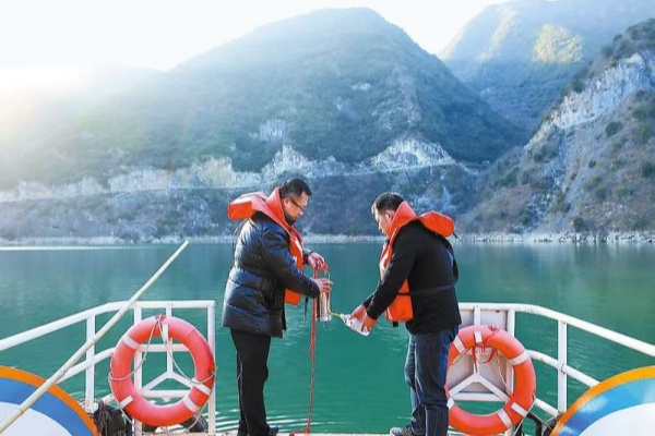李泉(左)和同事在蓮花臺水庫進行水質采樣