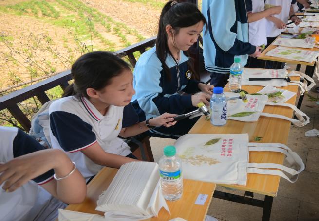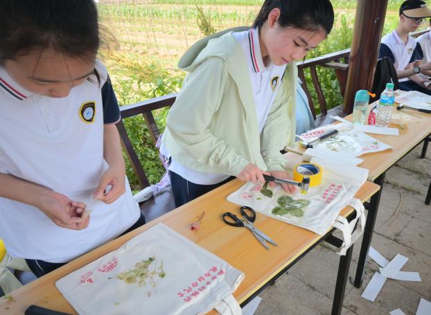 非遺文化體驗區成為傳承中華匠心的生動課堂。在梁義隆非遺技藝大師的指導下,同學們化身“小小糕點師”,揉面、塑形、烘焙,將紅薯原料化作香甜的傳統糕點。品嘗著親手制作的美味,孩子們在舌尖上觸摸到非遺文化的溫度,更在心中種下傳承的種子。而“探春印記”古法植物印染課程,則將環保理念與藝術創作巧妙融合。同學們用植物樹葉拓印環保袋,讓自然之美與低碳生活理念完美結合,每件作品都承載著對生態保護的深刻思考。