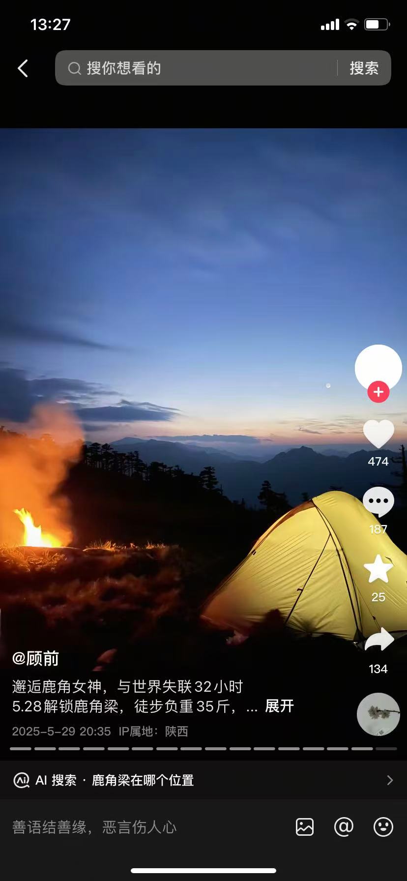 記者看到,周某利用抖音賬號“顧前”,發布非法穿越至秦嶺鹿角梁上的一段“縱火”視頻,視頻中,一頂帳篷旁邊是一燃燒的火堆,明火與煙霧清晰可見,不遠處則是茂密的樹林與層巒疊嶂的山峰,并配文“邂逅鹿角女神,與世界失聯32小時。528解鎖鹿角嶺”等內容。