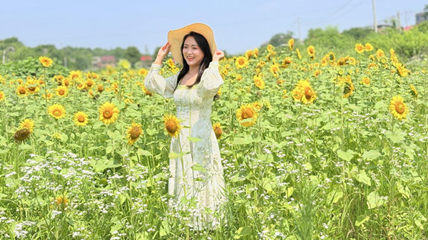6月6日清晨,湖南省邵東市周官橋鄉聯合村九六農莊,薄霧初散,晨光熹微。100畝、30萬株向日葵齊刷刷抬起金黃的臉龐,在田野間掀起壯闊的金色浪潮。飽滿的花盤如磨盤,鑲嵌著密集的葵花籽,微風吹拂,細茸茸的莖稈托起一個個沉甸甸的“小太陽”?;◤街?,頭戴草帽的游客彎腰取景,快門聲中,少女的碎花裙擺與黃瓣綠心的花朵撞色相映,驚起幾只白蝶翩躚飛向湛藍天際。農莊負責人劉黎指著遠處搖曳的新品種介紹:“今年比去年多栽了2萬株,這片浮光躍金的‘花?!A計將持續‘亮’到六月下旬?!?/p>