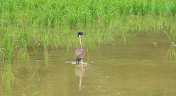 6月2日,新寧縣一位村民在鴨棚清點家禽時,意外發現一只受傷的大鳥。經專業辨認,這只體態獨特的鳥類正是世界30種最瀕危鳥類之一、對棲息環境要求苛刻的海南鳽,此前在新寧地區極為罕見。為全力救治這一“國寶”,當地救護員迅速將其送往崀山朱鹮保護站,安置于野化籠舍。經過飼養人員14天的精心照料,海南鳽身體狀況恢復良好,于6月17日在野化籠舍外的田間被放歸自然,振翅重返山林。