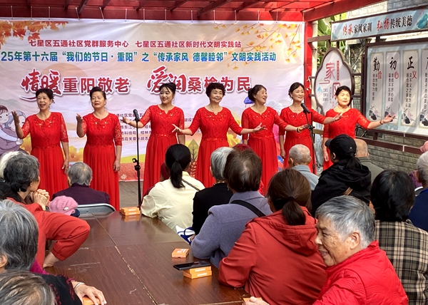 “居民們,快來吃粉啰?!?0月28日,桂林市七星區東江街道五通社區開展“重陽敬老”活動,載歌載舞歡度重陽節。在活動現場,合唱、彩調、舞蹈輪番上演,給社區的老人們帶來了一場精彩的文藝演出。在另一邊,社區的工作人員升好火,架起鍋,煮好肉湯,香氣四溢。志愿者們將做好的“長壽粉”一碗碗地端給了在場的老人們。老人們開心地吃著粉,聊著天,享受秋日的美好時光。