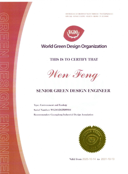 世界綠色設計組織2013年注冊于比利時布魯塞爾,是全球首個聚焦綠色設計推廣的非營利國際組織,擁有歐盟合法注冊資質及聯合國經社理事會特別咨詢商地位,2020年北京代表處正式獲批成立。該組織推行的“綠色設計工程師”資質,作為綠色設計國際標準14個子標準之一,核心是引領各行業綠色轉型,要求從業者具備綠色設計專業能力,能在產品、項目、工程全生命周期中實現資源消耗最小化、污染排放減量化,同時需兼具綠色思維、跨學科素養與協同創新能力,是對相關從業者應對全球氣候變化貢獻的重要肯定。