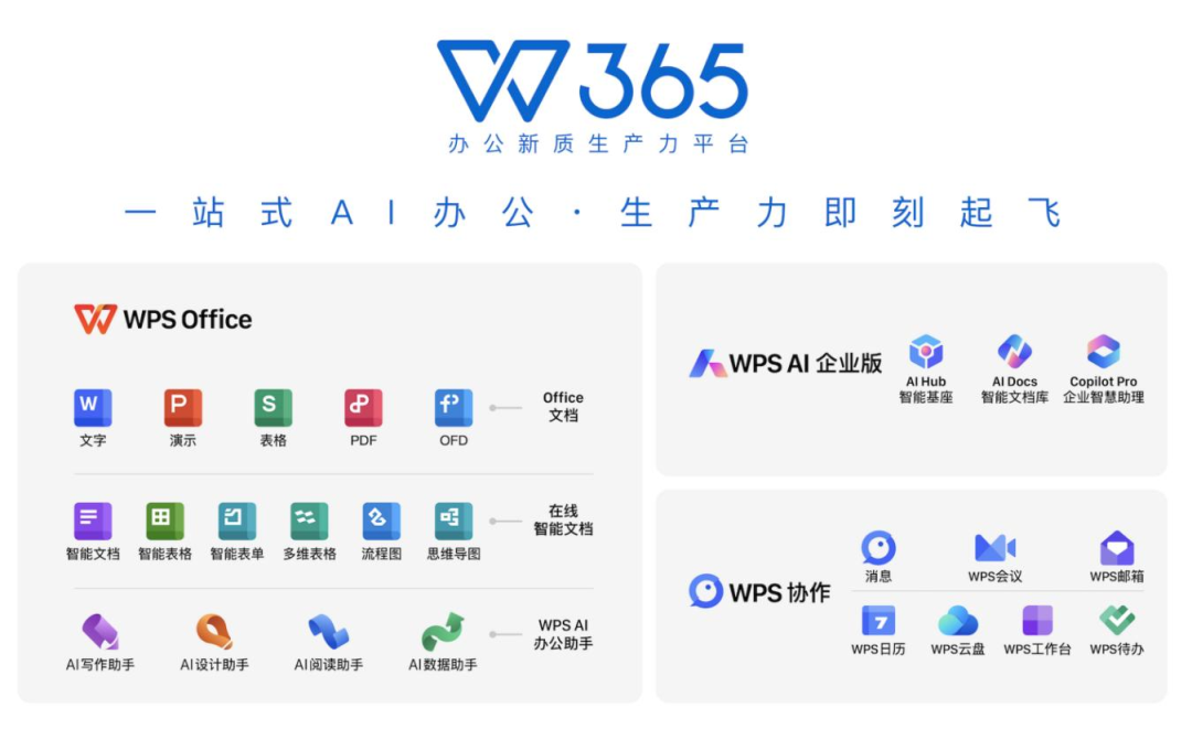 WPS 365,正是對趨勢的集中回應。它超越了單一文檔工具,整合了辦公套件、云與AI能力,實現文檔、IM、會議、郵件及AI應用的無縫銜接,減少了多系統切換導致的效率損耗。通過開放接口與生態合作,WPS 365還將協同能力嵌入到了企業現有數字化體系。