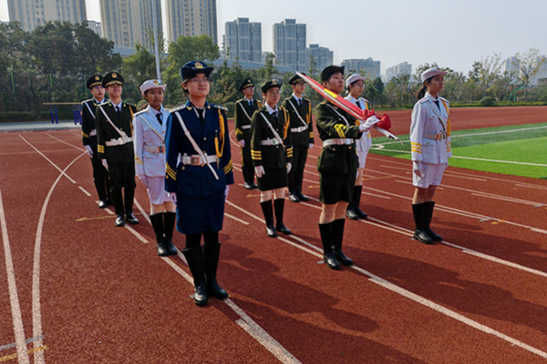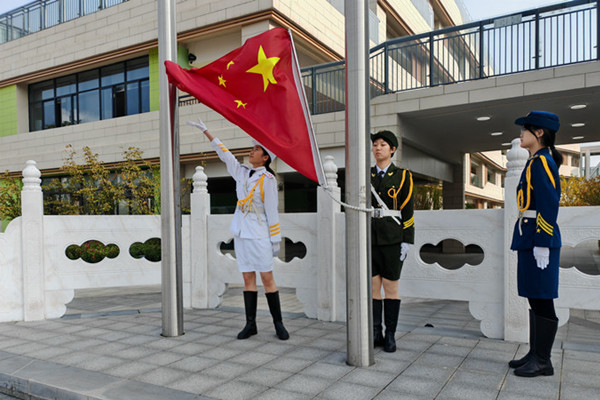 伴隨著雄壯的《義勇軍進行曲》,五星紅旗冉冉升起,全體師生肅立行注目禮,愛國情懷與奮進力量在晨光中激蕩。