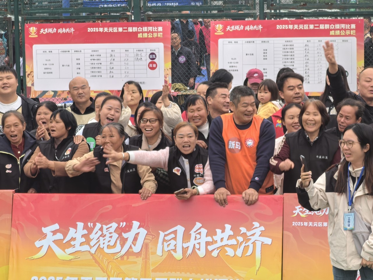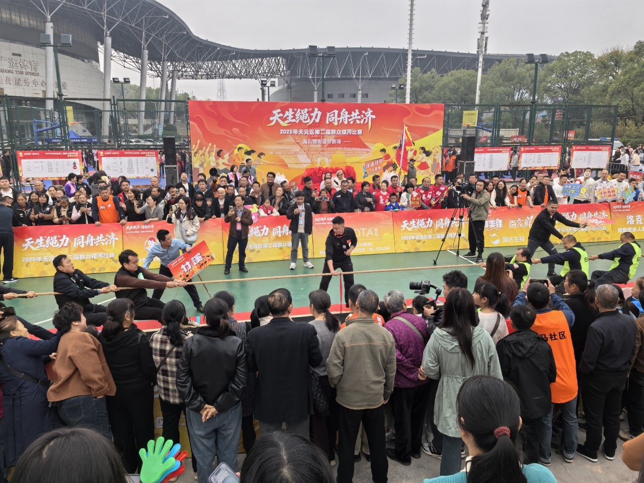 10月25、26日的上午,市體育中心籃球場人聲鼎沸,參加天元區第二屆群眾拔河比賽的102支社區(村)隊,開始了力量與意志的較量。賽場邊,由居民、社區工作者、社區合伙人等組成的助威團也不示弱,吶喊聲、歡笑聲交織成一片……