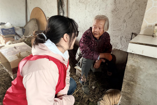 洪橋社區志愿者小謝走進楊中英奶奶家,看見老人正窩坐在灶臺后燒火做飯,“楊奶奶,現在才燒飯???”志愿者大聲地喊。楊中英老人年近九十,耳背嚴重,但精神狀態很好,笑瞇瞇地留志愿者吃飯并介紹著今天的菜——兩小碟蒸毛豆,一碟吃剩的魚?!澳棠?,為什么蒸兩盤毛豆啊”志愿者問,手上還不停的幫著添柴?!拔茵B了只貓,它吃得多,我給它吃一半。要是不喂飽了,晚上偷吃我雞蛋?!薄霸瓉硎侵火捸埌?!”灶臺后傳出一陣陣笑聲,屋內的舊物靜靜佇立,卻因這一老一小的對話滿是溫情。隨后,志愿者又關心了老人的身體狀況,并叮囑老人要注意保暖,雨天路滑,盡量減少出門。